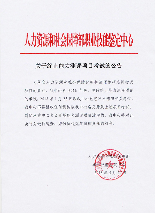 2018年1月人社部职业技能鉴定中心发布了《关于终止能力测评项目考试的公告》,说明国家人社部不再进行机动车行业“二手车鉴定评估师及汽车估损师等职业资格能力资质” 的考评。
