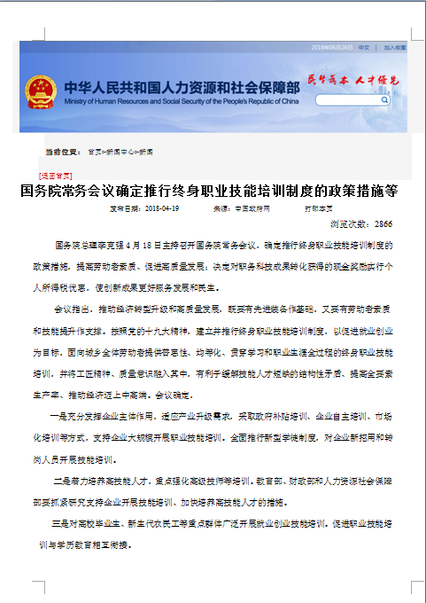 李克强总理在2018年4月18日国务院常务会议上确定“推行终身职业技能培训制度的政策措施。”会议当天确定推行终身职业技能培训制度的7项政策措施。“第四项是健全以职业能力为导向的人才评价、技能等级等制度。第五项是大力发展民办职业技能培训,鼓励企业兴办职业培训机构。”李克强总理强调“终身职业技能培训制度是推动国家经济转型和高质量发展的迫切需要。如今技能人才短缺已经成为制约高质量发展的瓶颈,不少企业为此展开争抢人才大战,政府要多方创造条件、增加供给。”各有关部门要抓紧把政策落实到实处,要在制度上推进终身职业技能培训,尽早从“人口红利”向“人才红利”转变。