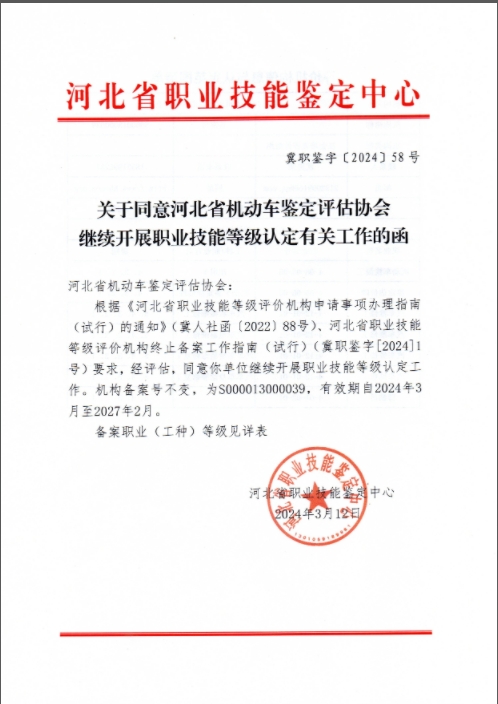 河北省机动车鉴定评估协会继续开展职业技能等级认定有关工作的函