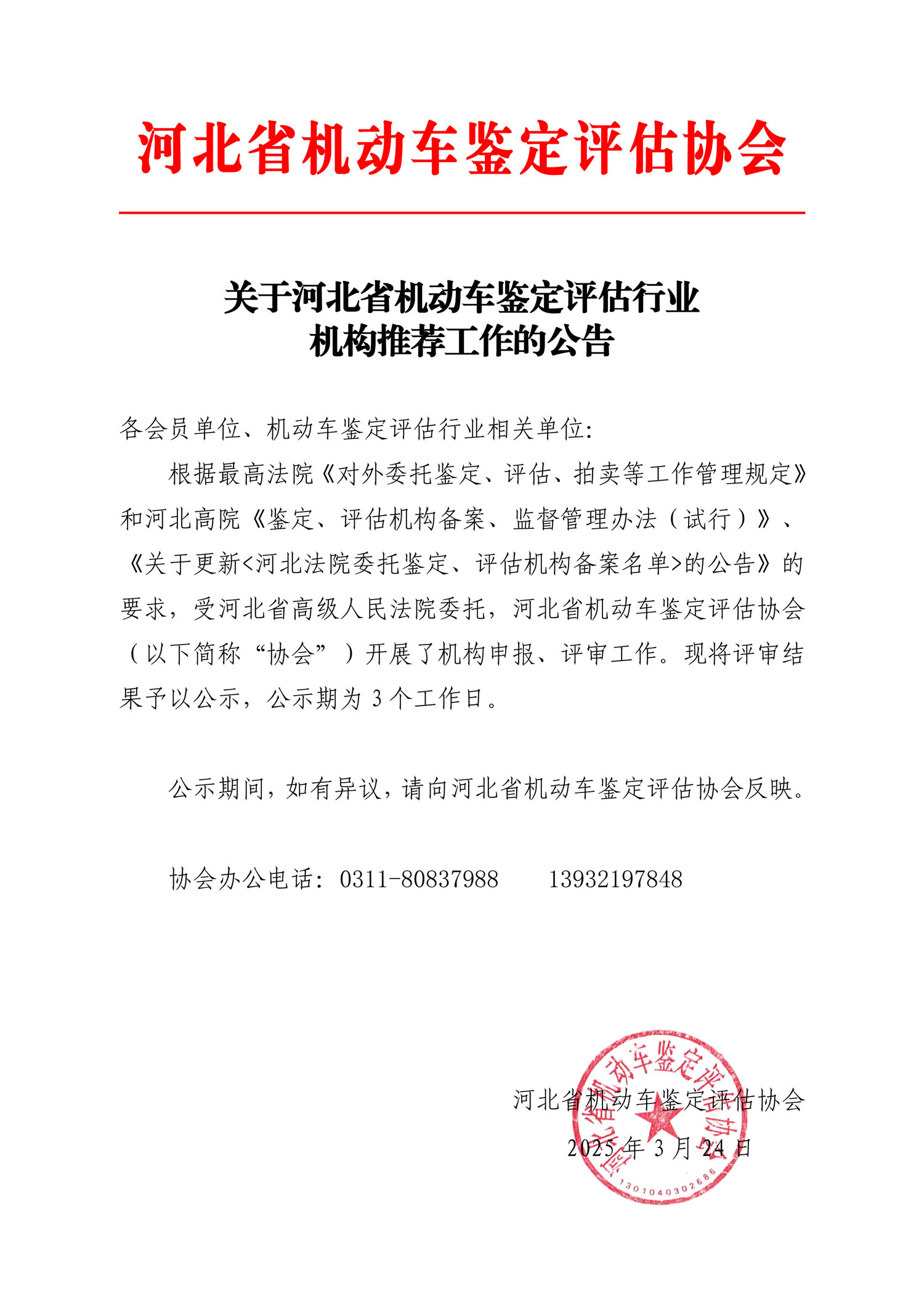 关于河北省机动车鉴定评估行业机构推荐工作的公告